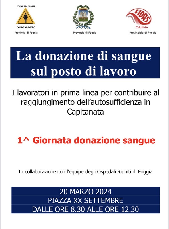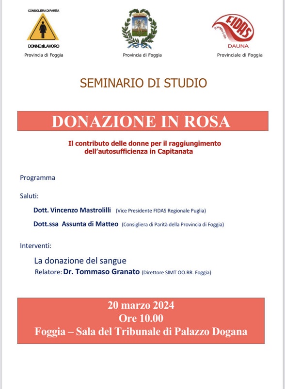 Provincia di Foggia – Prima giornata di donazione di sangue e seminario di studio “Donazione in rosa”