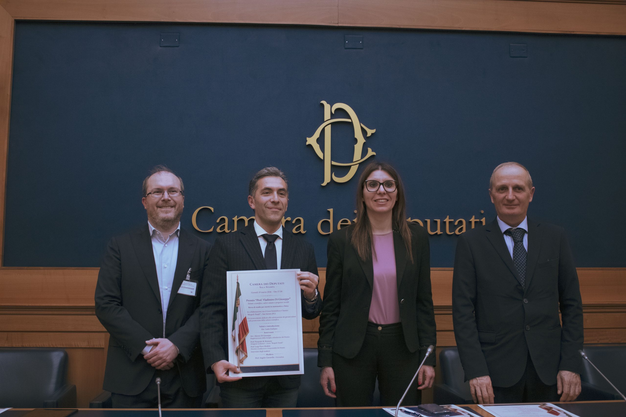 Giovedì 19 marzo 2025, alle ore 17.30 una rappresentanza di studenti di entrambi gli indirizzi, scelti tra coloro i quali si sono distinti nelle competizioni di matematica e fisica svolte nell’a.s. 2024-2025 e che sono stati premiati alla 4ª edizione del Premio Vladimiro Di Giuseppe, parteciperà a una cerimonia presso la Sala Stampa della Camera dei Deputati, alla presenza dell’On. Carla Giuliano, deputata della Repubblica e rappresentante del territorio di San Severo.