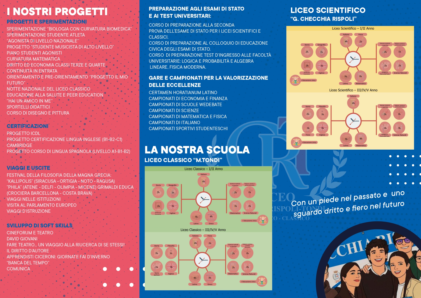 Il Liceo Checchia Rispoli-Tondi ha organizzato una serie di iniziative, per garantire agli studenti degli Istituti secondari di I grado, di conoscere a fondo le opportunità offerte dell’Istituto che, com’è noto, nasce dalla fusione dei due Licei storici della città di San Severo: il Liceo Classico e il Liceo Scientifico e che rappresenta, con la lunga esperienza che lo caratterizza, un punto di riferimento importante per la formazione culturale e umana dei giovani del Territorio.